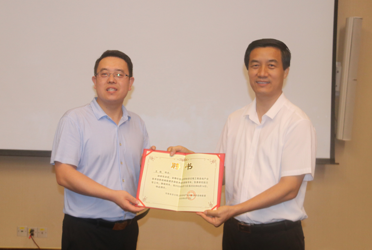 楊明宇理事長(zhǎng)為濟(jì)源技術(shù)研究院秘書長(zhǎng)王偉頒發(fā)聘書