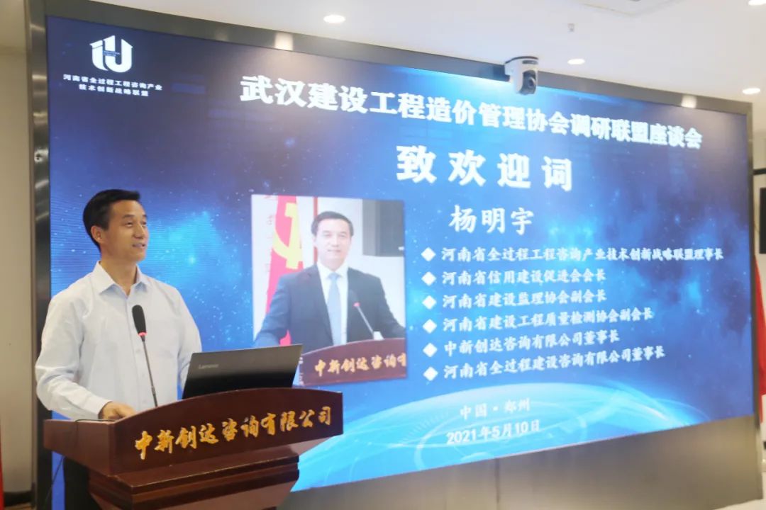 2021年5月10日下午,武漢建設(shè)工程造價(jià)協(xié)會顧問、湖北省造價(jià)協(xié)會副會長汪國剛,湖北省造價(jià)協(xié)會副會長、中德華建(北京)國際工程技術(shù)有限公司董事長汪建新,海天咨詢董事長韓江濤一行9人到聯(lián)盟調(diào)研交流。河南省全過程工程咨詢產(chǎn)業(yè)技術(shù)創(chuàng)新戰(zhàn)略聯(lián)盟理事長、中新創(chuàng)達(dá)咨詢有限公司董事長楊明字、中新創(chuàng)達(dá)咨詢有限公司執(zhí)行董事徐希萍、黨支部書記董高峰、河南省全過程工程咨詢產(chǎn)業(yè)技術(shù)創(chuàng)新戰(zhàn)略聯(lián)盟秘書長王偉及聯(lián)盟單位代表熱情接待并組織座談會。